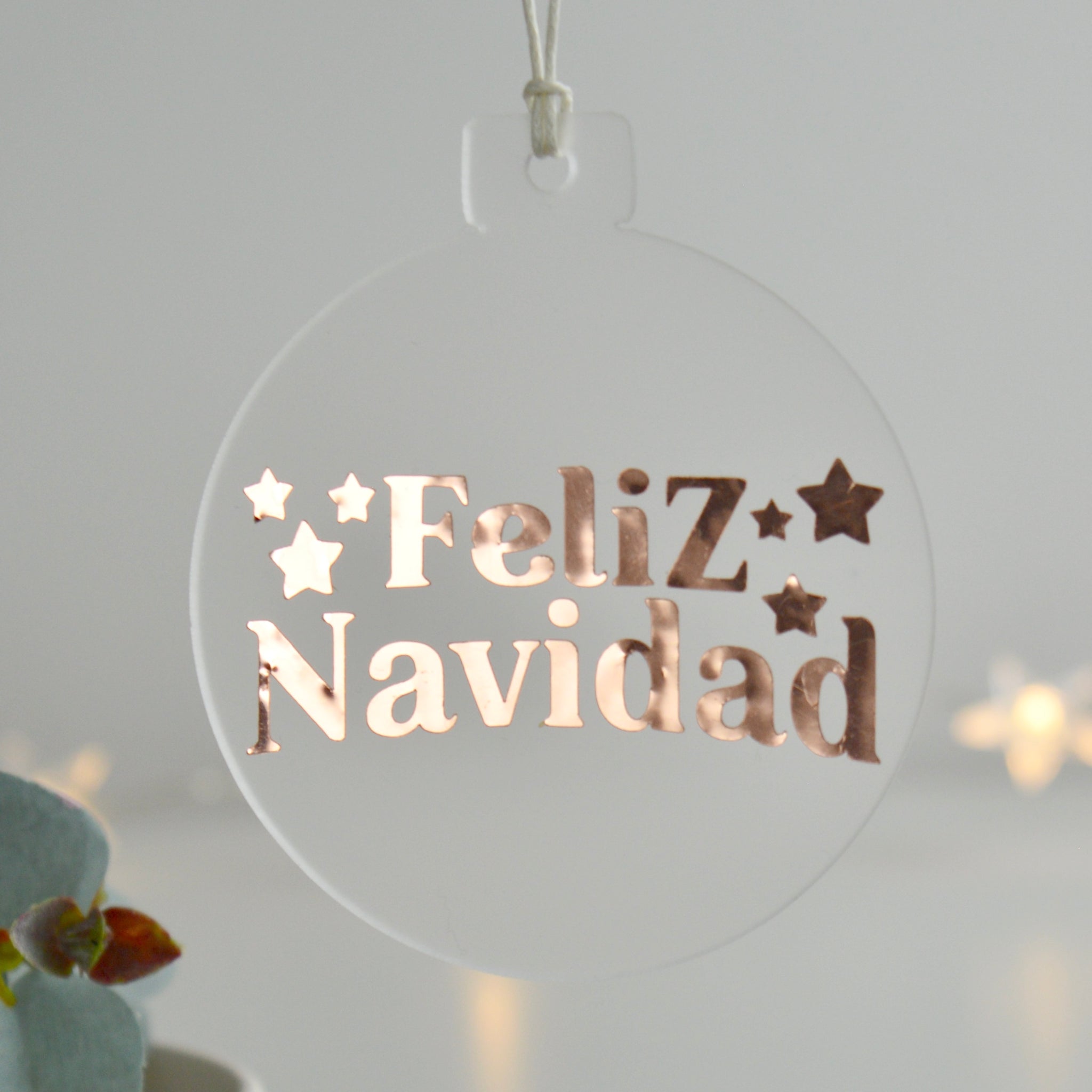 Spread joy and cheer with this Feliz Navidad acrylic ornament. Feliz Navidad is Happy Christmas in Spanish, choose from Clear or Frosted acrylic and a variety of colours with glitter, metallic or a matte finish. Perfect for Spanish-speaking households or anyone who loves a touch of international festivity on their tree!