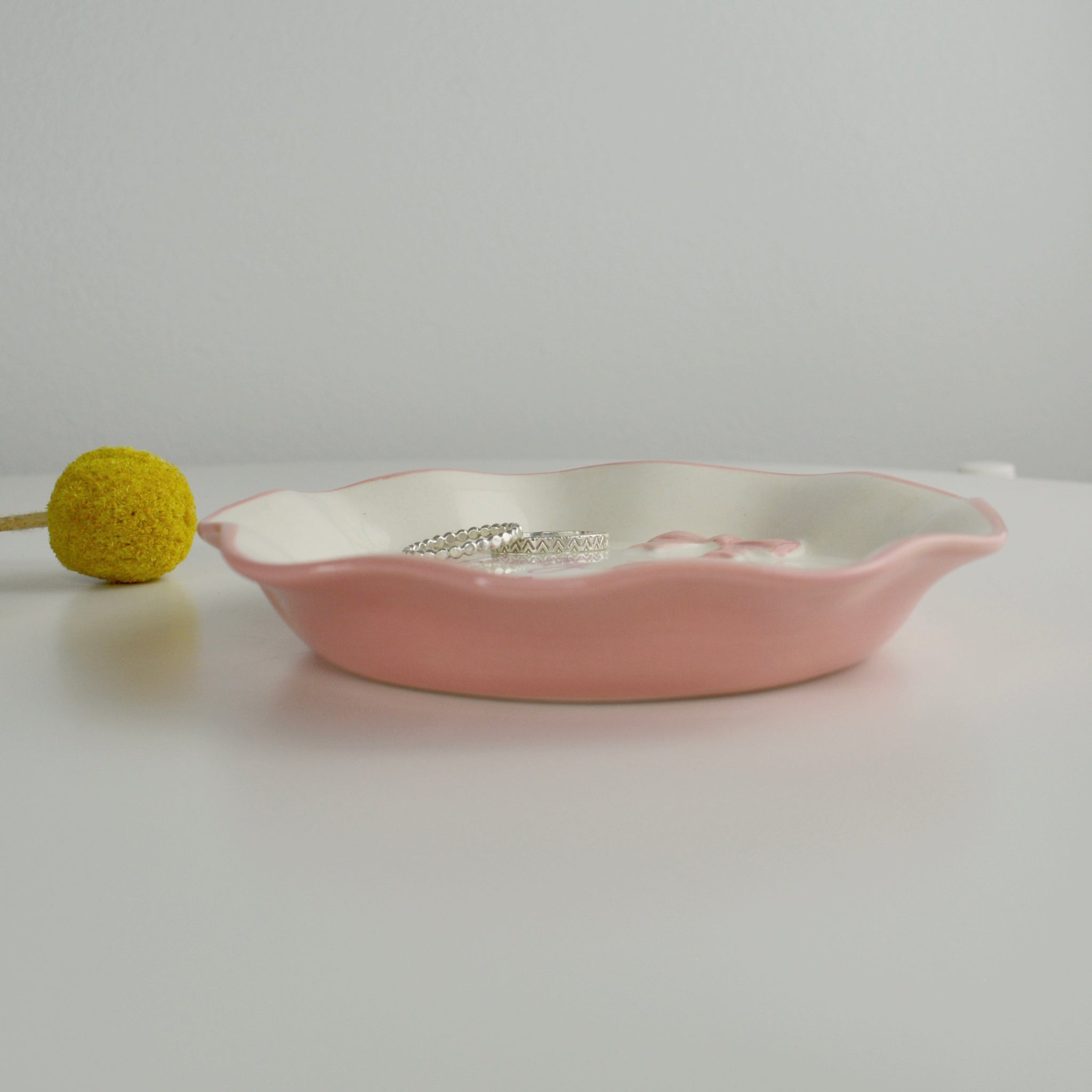The dish is ceramic and features a scalloped edge with soft pink trim. Perfect for holding small accessories like rings, earrings or even keys and coins. A touch of feminine charm for your bedroom. A lovely personalised gift for her.